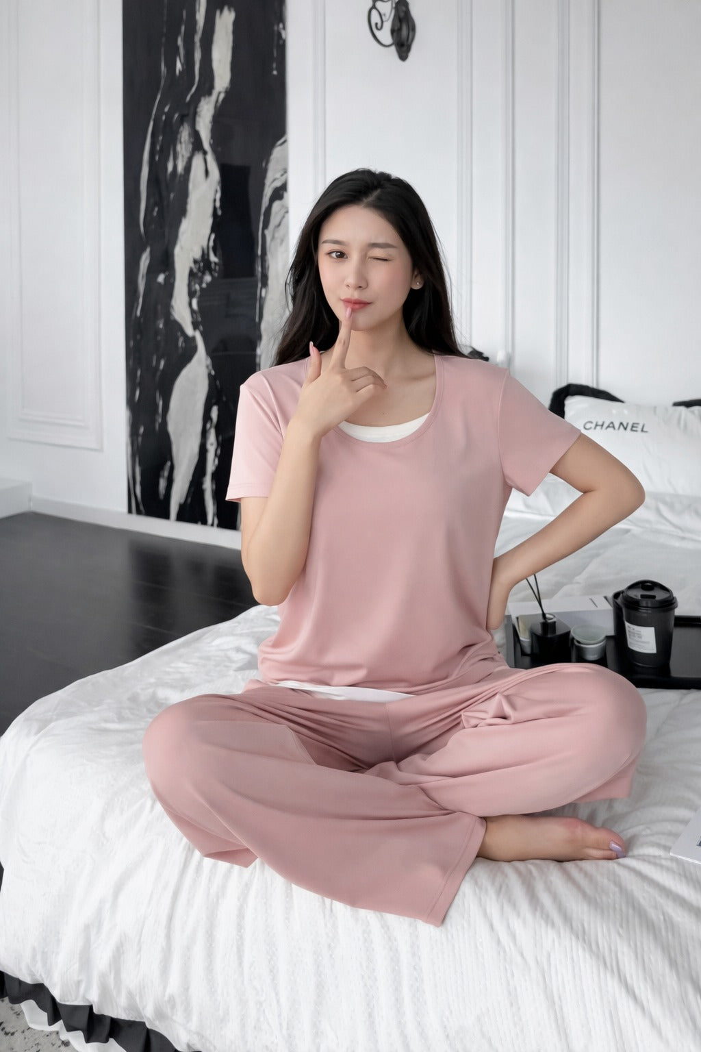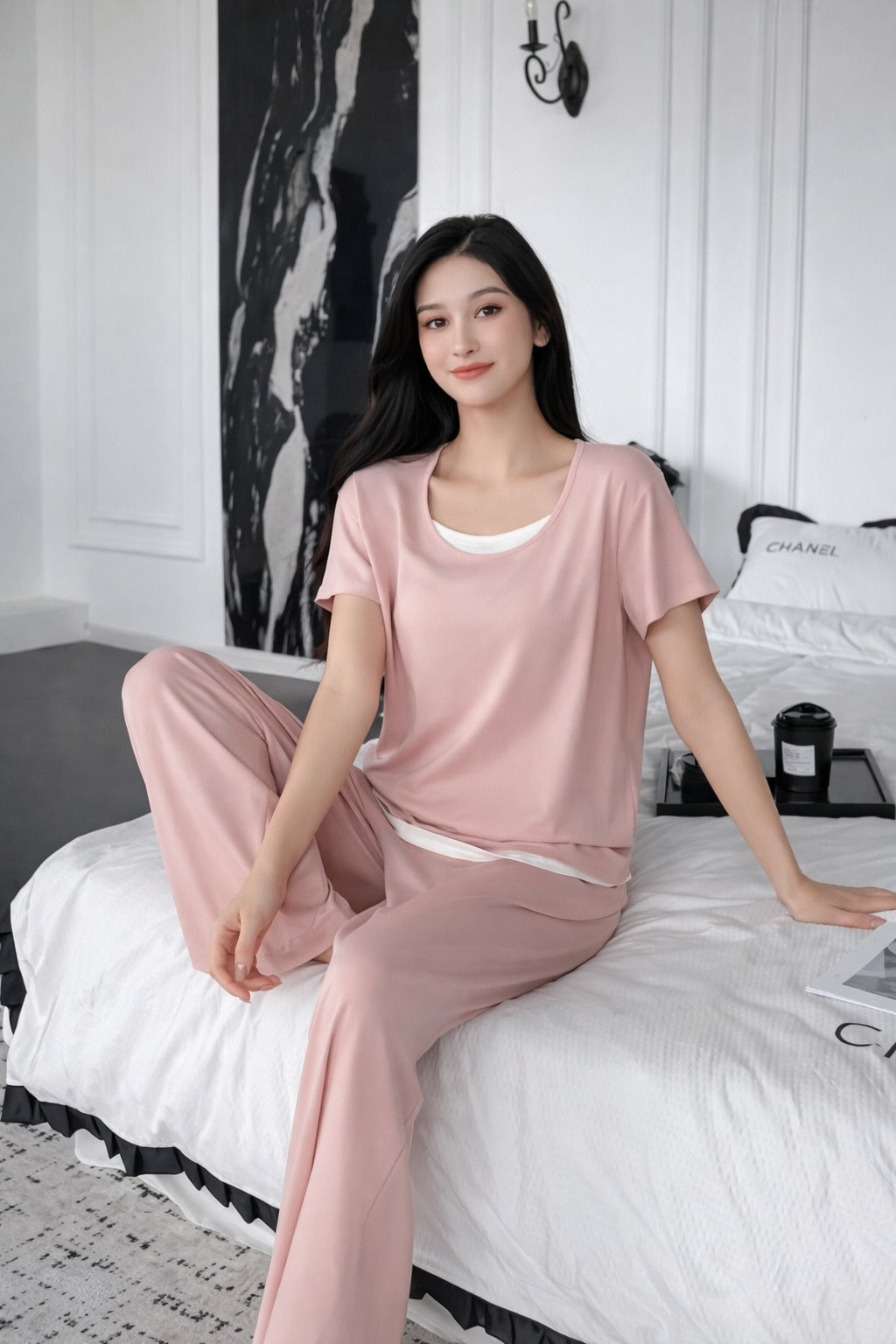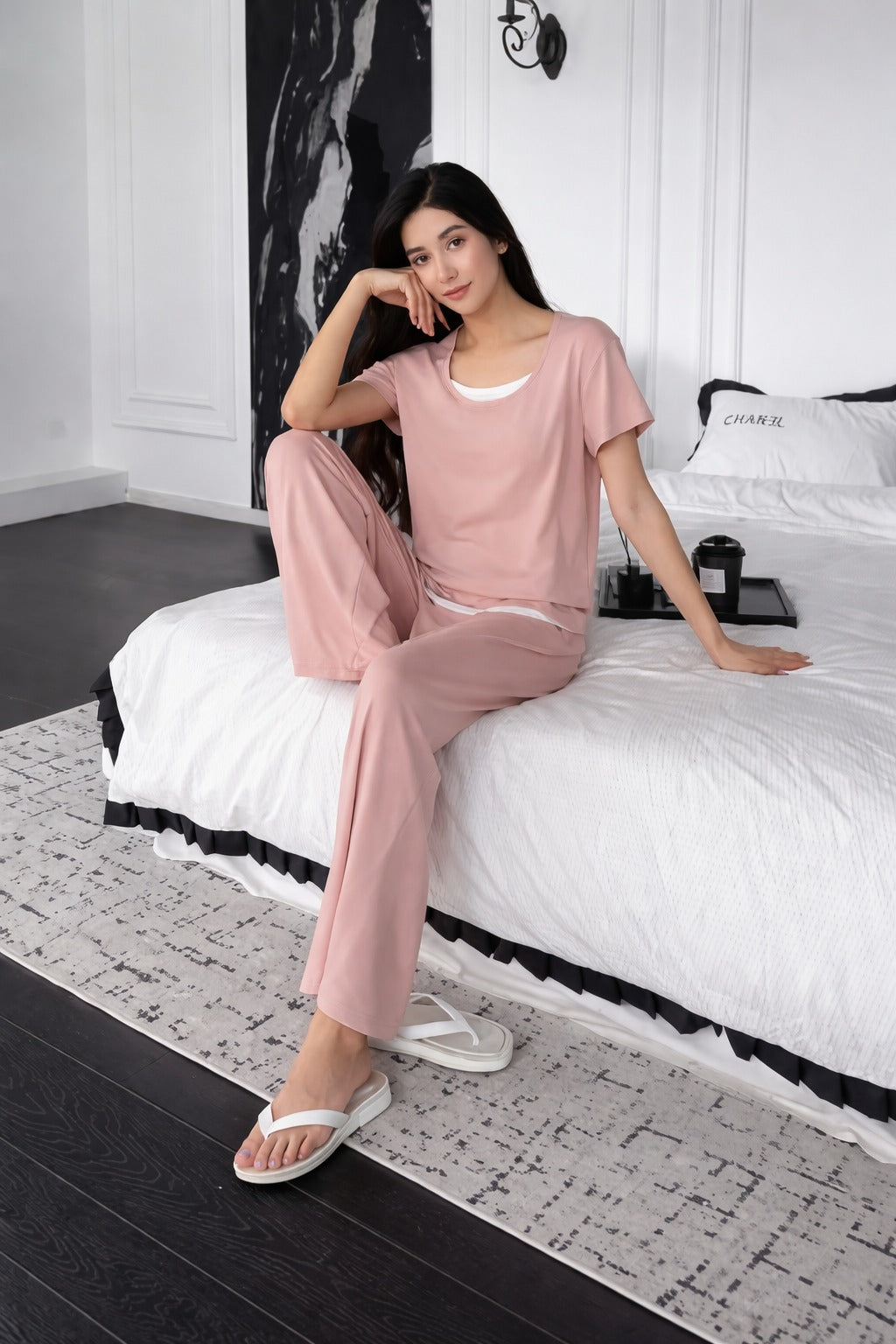 (New) Pink with white Round Neck Half sleeves with plazo night suit
