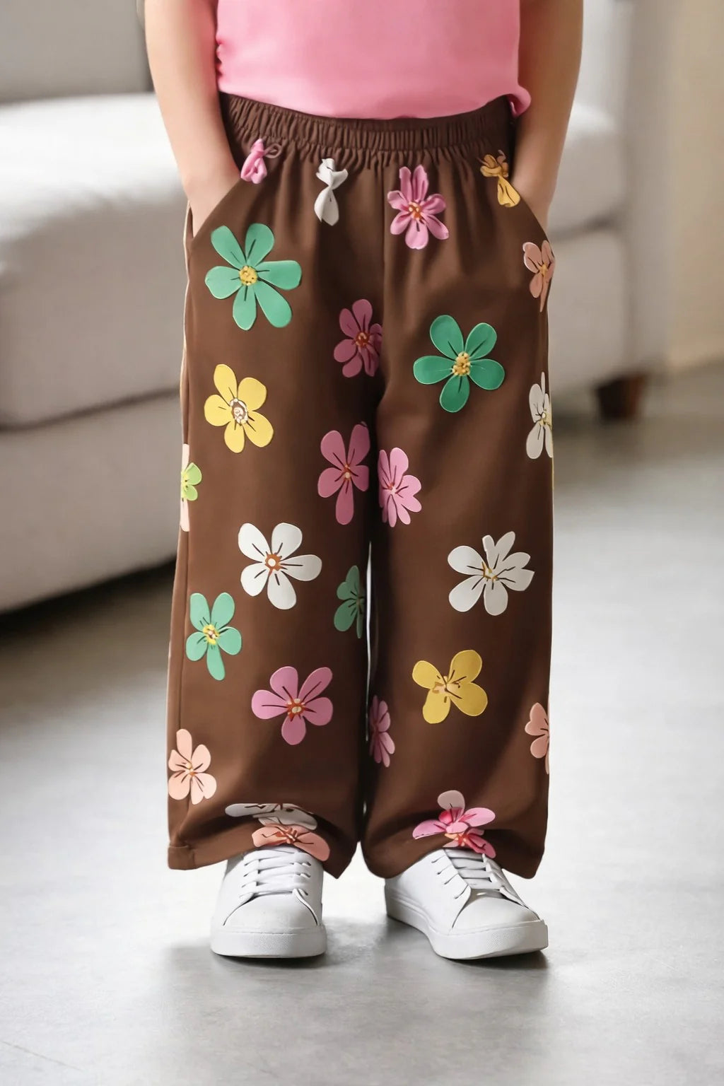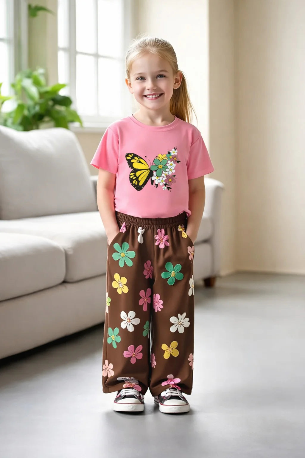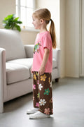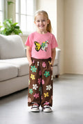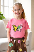 - Product Name : Pink multicolour big butterfly T shirt with brown Flowers printed pjs (RX-439)